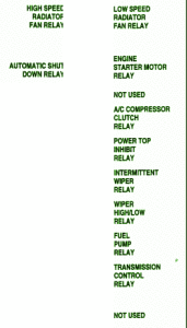 Fuse Panel Layout Diagram Parts: engine starter motor relay, high speed radiator fan relay, automatic shut down relay, low speed radiator fan relay, A/C compressor clutch relay, power top inhibit relay, intermittent wiper relay, wiper high/low relay, fuel pump relay, transmission control relay,