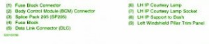 Fuse Panel Layout Diagram Parts: courtesy lamp socket, IP support to dash, windshield pillar trim panel, data link connector, fuse block connector, body control module, spice pack, fuse block, IP courtesy lamp,