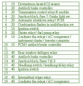 Fuse Panel Layout Diagram Parts: starter relay, radiator fan relay, rear window defogger, junction block, headlamp switch, instrument wiper relay, radiator fan relay, downstream heated O2 sensor, anti lock brake controller, transmission control relay, junction block, rake light, automatic shutdown relay, combination flasher in multifunction switch, ignition switch.