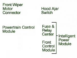 Fuse Panel Layout Diagram Parts: hood ajar switch, powertrain control module, front control module, intelligent power module, fuse relay center, front wiper moor connector.
