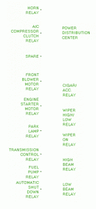 Fuse Panel Layout Diagram Parts: front blower motor relay, high beam relay, wiper on relay, cigar lighter, power distribution center, park lamp relay, transmission control, automatic shut down relay, horn relay, A/C compressor clutch relay.