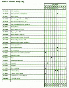 Fuse Panel Layout Diagram Parts: air conditioning, instrument cluster, horn, generator and regulator, module communication network, electronic engine control, audio unit, interior lighting, daytime running lamp, heating and ventilation, anti lock control, anti theft active, vehicle speed control, engine cooling charging n control, starting system, engine ignition, speakers, exterior lighting.