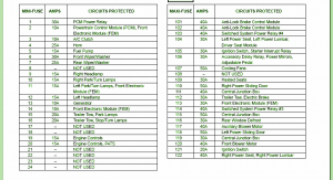 Fuse Panel Layout Diagram Parts: central junction box, trailer tow electronic box, switched system power relay, central junction box, auxiliary blower motor, ignition switch, power lumbar, accessory delay relay, adjustable padal, cooling fan, heated seat, right power sliding door, generator, trailer tow, park lamp, etop/turn lamp, engine control, anti lock brake control module, switches system power relay, PCM power relay, powertrain control module, A/C clutch, Horn, Fuel pump, wiper/washer, headlamp, right park, turn lamp, electronic module.