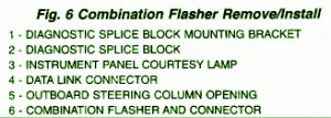 Fuse Panel Layout Diagram Parts: outboard steering column opening, combination flasher and connector, diagnostic splice block mounting bracket, instrument panel, courtesy lamp, data link connector.