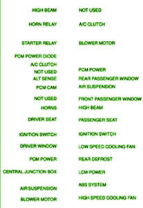 Fuse Panel Layout Diagram Parts: high beam, A/C clutch, starter relay, blower motor, power diode, PCM power, rear passenger window, passenger seat, ignition switch, driver seat, air suspension.