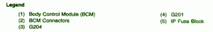 2001 Pontiac Sunfire 2.2 Front Fuse Box Diagram 2001 Pontiac Sunfire 2.2 Front Fuse Box Diagram 2001 Pontiac Sunfire 2.2 Front Fuse Box Map Fuse Panel Layout Diagram Parts: Body control module connector, body control module, G204, G201, IP fuse Block.