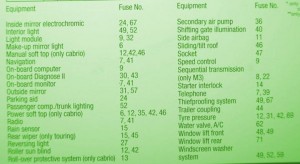 Fuse Panel Layout Diagram Parts: socket, speed control, starter interlock, telephone, trailer coupling, window lift, windscreen washer, passenger compartment, radio, rain sensor, rear wiper, roler sun blind, secondary air pump, side airbag,