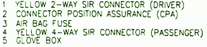 2002 Chevrolet Tracker Heater Fuse Box Diagram 2002 Chevrolet Tracker Heater Fuse Box Diagram 2002 Chevrolet Tracker Heater Fuse Box Map Fuse Panel Layout Diagram Parts: yellow connector, connector position assurance, air bag fuse, sir connector, glove box.