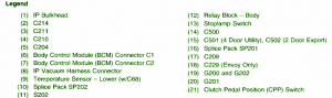 Fuse Panel Layout Diagram Części: Przegroda IP, moduł sterowania nadwoziem, złącze wiązki podciśnienia, czujnik temperatury, pakiet splotów, przełącznik świateł stopu, użyteczność drzwi, tylko envoy, pozycja pedału sprzęgła.
