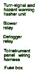2002 Mirage 3 Door Main Fuse Box Diagram 2002 Mirage 3 Door Main Fuse Box Diagram 2002 Mirage 3 Door Main Fuse Box Map Fuse Panel Layout Diagram Parts: blower relay, turn signal, hazard warning flasher unit, defogger relay, fuse box, to instrument panel wiring harness.