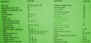 Fuse Panel Layout Diagram Parts: instrument cluster, airbag, air conditioner, blower, brake light, central locking system, hinged window, horn, immobilizer, DSC 4 wheel driver, electric fan, folding outside mirror, front fog light, fuel pump, cigar lighter, ABS system, adjustment driver seat, adjustment passenger seat, engine control, garage door opened, glove box light, headlamp, headlight cleaning, heated rear window, electric seat heater, heated spray nozzle.