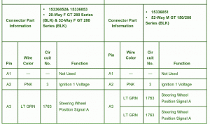2003 Chevrolet Suburban, 5.3L 4WD Lenksäulen-Sicherungskastenplan 2003 Chevrolet Suburban, 5.3L 4WD Lenksäulen-Sicherungskastenplan 2003 Chevrolet Suburban, 5.3L 4WD Lenksäule Sicherungskastenplan Sicherungsschalttafel-Layout Teile: Zündspannung, Lenkradpositionssignal A, Masse, Stecker.