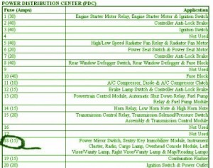 Fuse Panel Layout Diagram Parts: transmission solenoid, pressure switch, assembly, transmission control module, power mirror switch, sentry key immobilizer, radio, cargo lamp, overhead console module, ignition switch, power outlet, starter motor relay, ignition switch, controller anti lock brake, ignition switch, low speed radiator fan, radiator fan motor, power seat switch, window defogger switch, A/C compressor, diode, A/C compressor clutch, brake lamps switch, controller anti lock brake, horn relay, high horn note, transmission control relay.