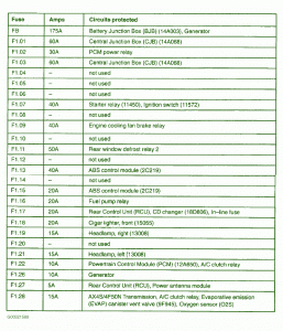 Fuse Panel Layout Diagram Parts: rear control unit, power antenna module, evaporative emission, powertrain control module, A/C clutch relay, generator, canister vent valve, oxygen sensor, ABS control module, fuel pump relay, rear control unit, CD charger, cigar lighter, headlamp, battery junction box, cantral junction box, PCM power relay, starter relay, ignition switch, engine cooling fan brake relay, rear window defrost.