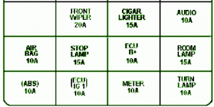 2003 Kia Spectra Compartment Fuse Box Diagram 2003 Kia Spectra Compartment Fuse Box Diagram 2003 Kia Spectra Compartment Fuse Box Map Fuse Panel Layout Diagram Parts: front wiper, cigar lighter, audio, room lamp, air bag, stop lamp, ECU, ABS system, ignition coil, meter, turn lamp.
