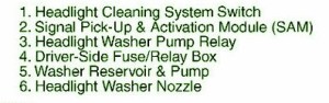 Fuse Panel Layout Diagram Parts: headlight cleaning system switch, signal pick up, activation module, washer reservoir, headlight washer nozzle, headlight washer pump relay, driver side fuse,