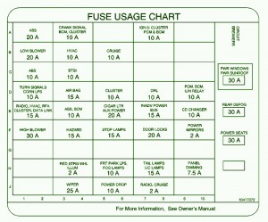 Schemat rozmieszczenia bezpieczników Części: klaster PCM, niska dmuchawa, HVAC, tempomat, kierunkowskazy, poduszka powietrzna, klaster instrumentów, zmieniarka CD, dmuchawa, światła awaryjne, światło stopu, zamek drzwi, lusterko elektryczne, światła postojowe, lampy tylne, ściemnianie panelu, wycieraczka, radio, tempomat, światła do jazdy dziennej, radio, łącze danych, system ABS, zapalniczka do cygar, sygnał korbowy Klaster ECU.