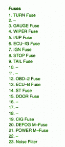 Fuse Panel Layout Diagram Parts: door fuse, cigar lighter, defogger, power window, ignition fuse, turn fuse, gauge fuse, power steering fuse, wiper fuse, stoplamp fuse, taillight fuse, noise filter, I/UP fuse, ECU-IG fuse.