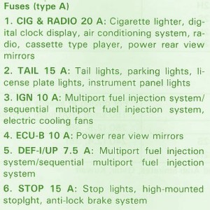 Fuse Panel Layout Diagram Parts: anti lock brake system, tail light, parking lamp, instrument panel light,electric cooling fan, multiport fuel injection, cigar lighter, digital clock display, air conditioning, radio, cassette tape player, power rear view mirror, stop light,