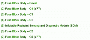 Fuse Panel Layout Diagram Parts: fuse block body C5C4, fuse block body C3, fuse block body C2, fuse block body cover, fuse block body C1, inflatable restraint sensing and diagnostic module, fuse block body.