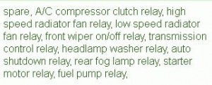 Fuse Panel Layout Diagram Parts: headlamp washer relay, auto shutdown relay, rear fog lamp relay, starter motor relay, fuel pump relay, spare, A/C compressor clutch relay, high speed radiator fan relay, low speed radiator fan relay, front wiper on/off relay, transmission control relay.
