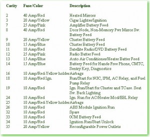 Fuse Panel Layout Diagram Parts: heated mirror, cigar lighter, ignition coil, amplifier battery, door node, battery feed, sentry key, diagnostic, run/start for NGC, IPM, AC relay, satelite radio, DVD battery feed, air conditioner, hands free phone, fuel pump relay, start for cluster, back light, heater module, EBL relay, ABS module, ignition run, OCM battery feed, reconfigurable power outlet, cluster battery feed.
