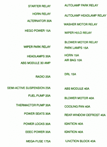 Fuse Panel Layout Diagram Parts: thermactor pump, power seats, power lock, mega fuse, horn air bag, daytime running lamp, ABS module, blower motor, autolamp park relay, auto lamp headlamp relay, washer motor relay, wiper hi lo relay, park lamps, starter relay, horn relay, alternator relay, wiper park relay, headlamps, ABS module, radio, active suspension, fuel pump,