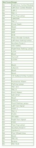 Fuse Panel Layout Diagram Parts: Blank, HVAC B, Rain sense Wipers, Parking Lamps, Front Parking Lamps, Sunroof, Door Control Module, LGM, TBC, Fog Lamps, LGM/DSM, Power Seats, DDM, AMP, PDM, Rear Climate Controls, LOCK, Left Rear Parking Lamps, Auxiliary Power, VEH CHMSL, Right Rear Parking Lamps, TBC IGnition, Brakes, TBC RUN, Left Turn Signal, Radio, TR PARK, Right Turn Signal, HVAC, Rear Fog Lamps, Front Wipers, vehicle stop, Ignition, Four-Wheel Drive, OH Battery/On Star System,