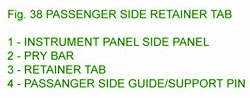 Fuse Panel Layout Diagram Parts: passanger side guide, support pin, instrument panel side panel, PRY bar, retained tab.