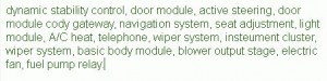 Fuse Panel Layout Diagram Parts: dynamic stability control, door module, active steering, door module cody gateway, navigation system, seat adjustment, light module, A/C heat, telephone, wiper system, insteument cluster, wiper system, basic body module, blower output stage, electric fan, fuel pump relay.