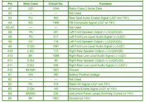 Fuse Panel Layout Diagram Parts: radio, rear seat audio enable signal, FM composite signal, speaker output, level audio signal, battery positive voltage, radio or signal, antenna enable signal, instrument panel lamp, ground.
