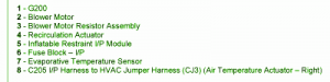Fuse Panel Layout Diagram Parts: blower motor resistor assembly, recriculation actuator, inflatable restraint, blower motor, fuse block, evaporative temperature sensor, I/P harness.