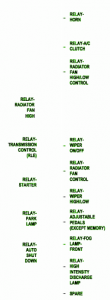 Fuse Panel Layout Diagram Parts: radiator fan highlow control, A/C clutching, radiator fan control, adjustable pedals, fog lamp front, high intensity discharge lamp, radiator fan relay, transmission control relay, starter relay, park lamp relay, auto shutdown relay, wiper relay.