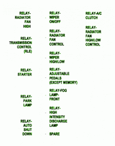 Fuse Panel Layout Diagram Parts: starter, radiator fan, transmission control, park lamp, wiper, auto shut down, radiator fan control, high intensity discharge lamp, fog lamp, wiper high/low, radiator fan high/low control, AC clutch.