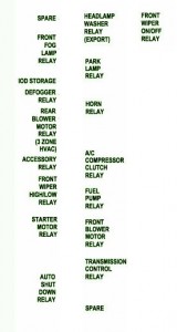 Fuse Panel Layout Diagram Parts: headlamp washer, park lamp relay, horn relay, accessory relay, front wiper high low relay, starter motor relay, rear blower motor relay, front blower motor relay, transmission control relay, auto shut down relay, A/C compressor clutch relay, front fog lamp relay, defogger relay, fuel pump relay.