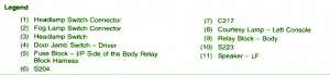 Fuse Panel Layout Diagram Parts: body relay block harness, courtesy lamp, relay block, speaker, headlamp switch connector, headlamp switch, door jamb switch, fog lamp switch connector.