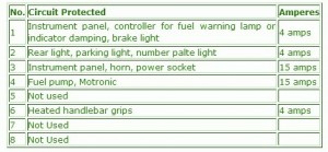 Fuse Panel Layout Diagram Parts: Heated handlebar grips, brake light , Rear light, parking light, number palte light, controller for fuel warning lamp or indicator damping, Instrument panel, horn, power socket, instrument panel, Fuel pump, Motronic.
