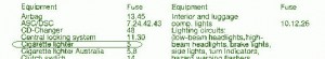 Fuse Panel Layout Diagram Parts: low beam headlight, lighting circuit, high beam headlight, brake light, side light, turn indicator, interior and luggage, air bag, ASC/DSC, CD charger, central locking system, cigar lighter.