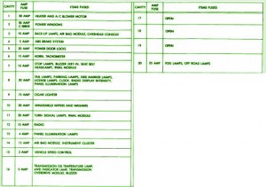 Fuse Panel Layout Diagram Parts: sindshield wiper n washer, turn signal lamp, radio, panel illumination lamp, air bag module, instrument cluster, vehicle speed sensor, heater, blower motor, back up lamp, power window, air bag module, overhead console, ABS brake system, power door lock, horn tachometer, stop lamp, parking lamp, license lamp, clock, radio display, panel illumination lamps.