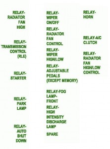 Fuse Panel Layout Diagram Parts: fog lamp, high intensity discharge lamp, horn relay, A/C clutch, radiator fan control, relay starter, relay park lamp, relay auto shutdown, relay wiper on/off, relay radiator fan high, relay transmission control, relay adjustable pedal, relay radiator fan control, relay wiper.