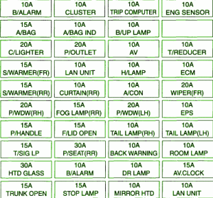 Fuse Panel Layout Diagram Parts: alarm, air bag, instrument cluster, trip computer, up lamp, engine sensor, LAN unit, head lamp, ECM, curtain, air conditioner, power window, tail lamp, power seat, heated glass, alarm, daytime running lamp, clock, stop lamp, heated mirror.