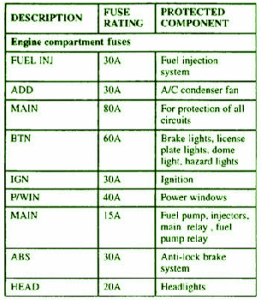 Sicherungskasten-Layout Teile: Kraftstoffeinspritzung, Klimakondensatorgebläse, Schutz aller Schaltkreise, Antiblockiersystem, Scheinwerfer, Kuppellicht, Warnblinkanlage, Zündung, Bremslicht,