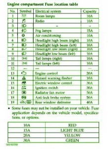 Fuse Panel Layout Diagram Parts: fog lamp, air conditioning, headlamp high beam, rear window defroster.radiator fan motor, anti lock brake system, hazard warning flasher, electric window, control, headlight low beam, tail lamps, engine control, room lamp, radio, ignition switch,