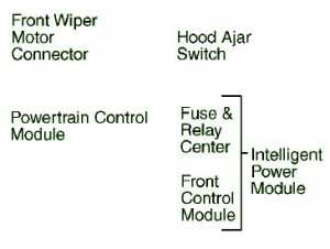 Fuse Panel Layout Diagram Parts: intelligent power module, fuse relay center, front wiper moor connector, powertrain control module, hood ajar switch, front control module,