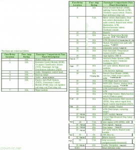 Fuse Panel Layout Diagram Parts: stop switch signal feed, powertrain control module, ignition coil relay, lighting control moduel, overdrive control module, instrument cluster, hazard, adjustable pedals, speed control deactivation, park light, brake signal, turn signal, stop lamp, heated seat module, restraint control module, dual automatic temperature control, cigar lighter, heated seat module, power mirror, analog clock, overdrive console, multifunction switch, passenger air bag, audio, navigation control head, back up lamp.