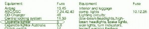 Fuse Panel Layout Diagram Parts: cigar lighter, interior and luggage, comp lights, side light interior indicator, airbag, cd player, central locking system, lighting circuit, low beam headlight, brake light.