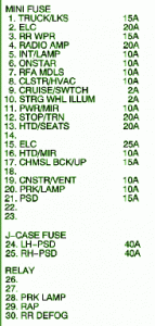 Fuse Panel Layout Diagram Parts: wiper, radio, instrument cluster, cruise/switch, power mirror, park lamp, PSD, rear defogger, internal lamp, on star, RFA modules, truck, electric, stop lamp, heated seat, heated mirror, back up lamp.