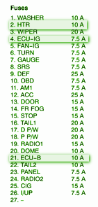 Sicherungskasten-Layout Teile: Radio, Zigarettenanzünder, Türschloss, Nebelscheinwerfer, Rücklicht, elektrische Fensterheber, Waschanlage, Heizung, Scheibenwischer, ECU-Zündung, Gebläsezündung, Blinker, Messgerät, Entfogger-Relais, Radio, Kuppellicht,