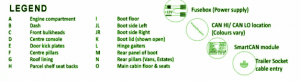 Fuse Panel Layout Diagram Parts: rear panel, rear pillars, main cabin floor, engine compartment, dash, front bulkheads, center console, boot floor, boot side, boot lid, hinge gaiters, door kick panel, center pillars, roof lining.