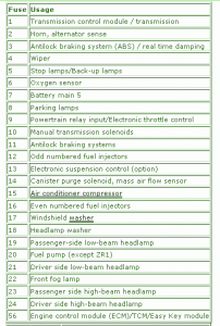 Fuse Panel Layout Diagram Parts: Fuel pump, Driver side low-beam headlamp, Front fog lamp, Passenger side high-beam headlamp, Driver side high-beam headlamp, Engine control module, Manual transmission solenoids, Antilock braking systems, Odd numbered fuel injectors, Transmission control module / transmission, Horn, alternator sense, Antilock braking system (ABS) / real time damping, Wiper, Stop lamps/Back-up lamps, Oxygen sensor, Battery main, Parking lamps, Powertrain relay input/Electronic throttle control, Electronic suspension control, Canister purge solenoid, mass air flow sensor, Air conditioner compressor, Even numbered fuel injectors, Windshield washer, Headlamp washer, Passenger-side low-beam headlamp.